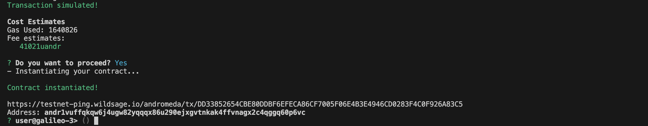 Note that the instantiation message will not be the exact same for you since you will be using a different recipient address.