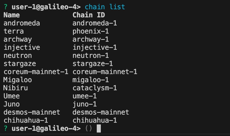 You will notice something similar to ? user@galileo-3> in the CLI. This signifies which wallet and chain-Id are currently in use. It is formatted in the following way: