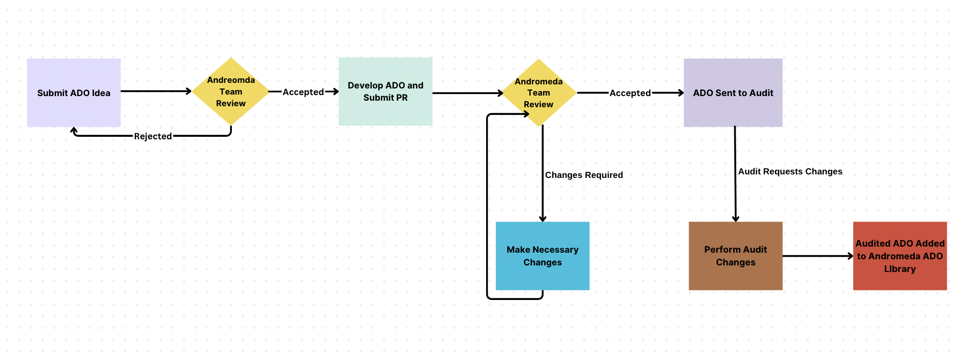 The following document will explain the steps required for a developer to submit their ADO to be included in the official Andromeda ADO library as well as requesting new features for existing ADOs. The workflow can be summarized by the following diagram: