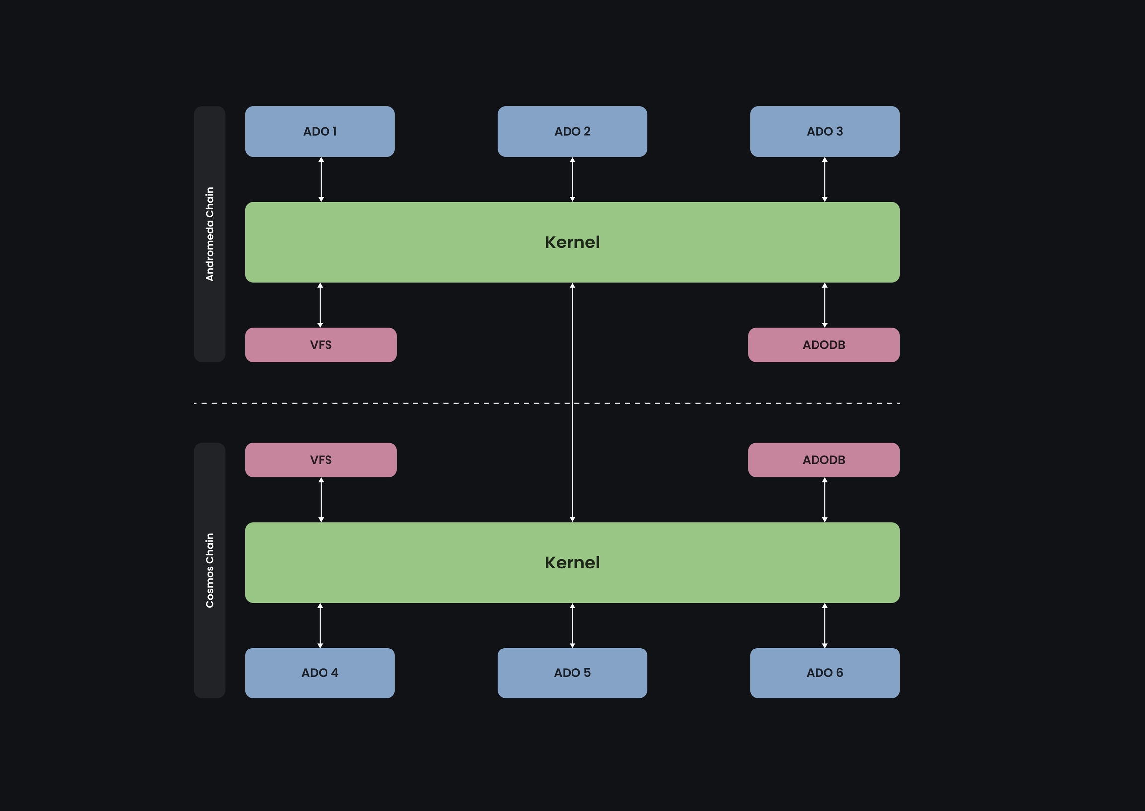 The Kernel ADO of each chain is responsible for handling and relaying IBC messages. When the Kernel receives an AMP packet So for example, if ADO 1 (On the Andromeda chain) wishes to send a message to ADO 5 (On another Cosmos chain) :