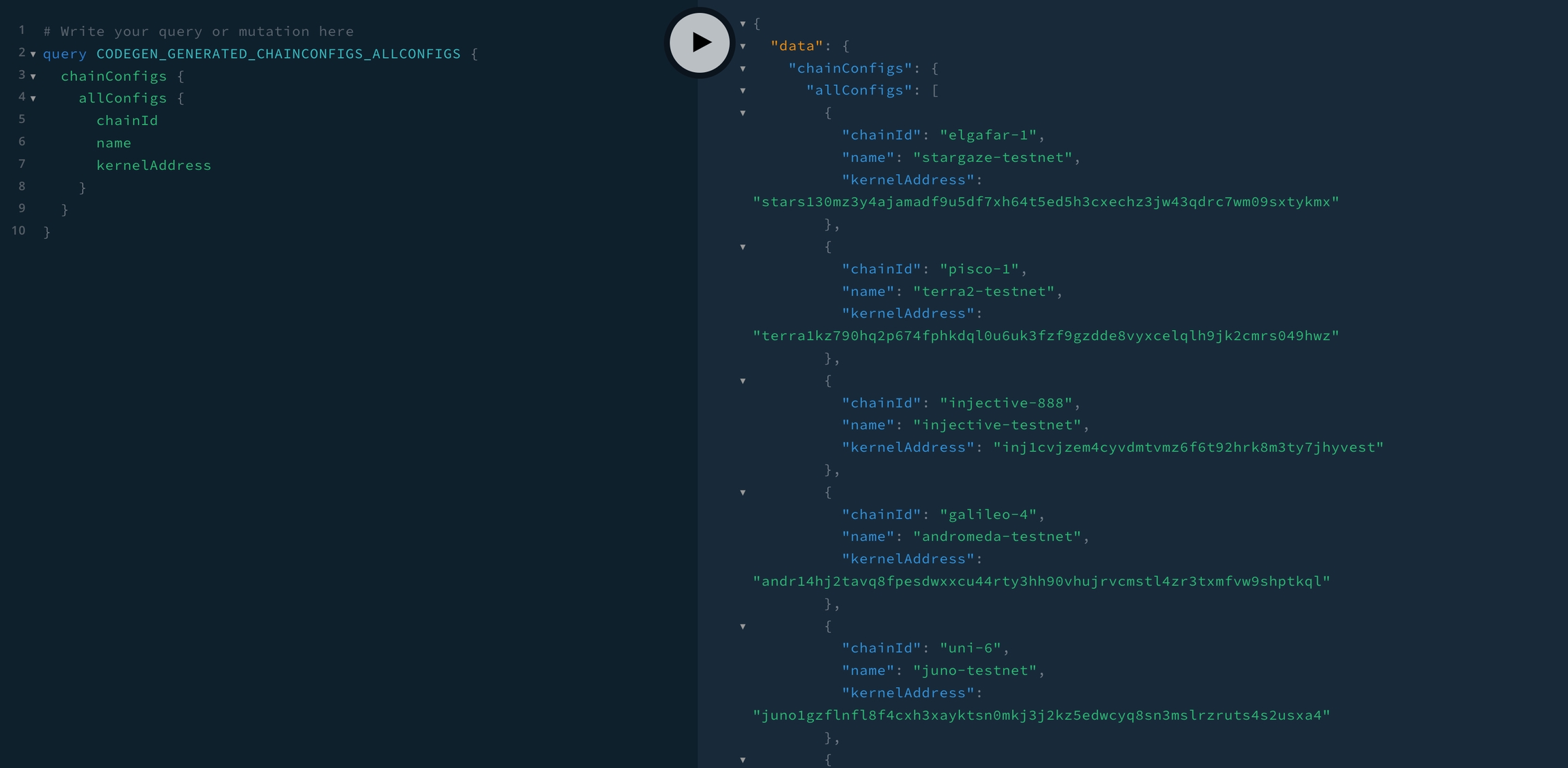 To get the list of kernel addresses for testnet chains, we can use the chainConfigs query in the GQL playground.